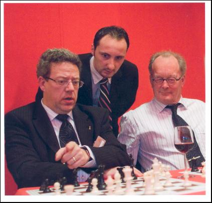 Topalov kijkt belangstellend toe bij de simultaan wedstrijd die ik hier speel tegen Ivan Sokolov. Deze simultaan is een vast onderdeel op de managementavond van het Corus schaaktoernooi. Een dertigtal managers neemt het dan op tegen een grootmeester. Het resultaat is dan ook meestal voorspelbaar