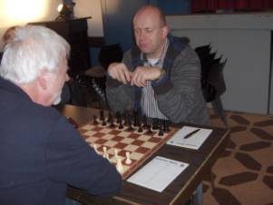 Gerard had een relatief zwakke tegenstander (rating 1716) en kwam in punten weer gelijk met Erik. Dick speelde, net als in de vorige ronde, aan de laatste tafel (48), maar kon weer niet van de hatelijke nul afkomen. Willem en ik troffen elkaar in deze ronde en ik speelde weer met zwart, net als drie dagen daarvoor. Hieronder is te zien hoe Erik er als de kippen bij was om onze vreugde over deze loting vast te leggen.